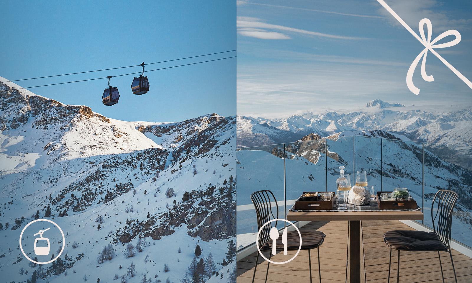 Émerveillez une personne spéciale en lui offrant La Stella : l’expérience complète d’un panorama sans limites associée aux saveurs des Alpes. Ce coffret cadeau est un véritable voyage multisensoriel qui combine l’émotion d’une montée panoramique en télécabine avec un déjeuner alpin sous forme de buffet à 2 723 mètres.